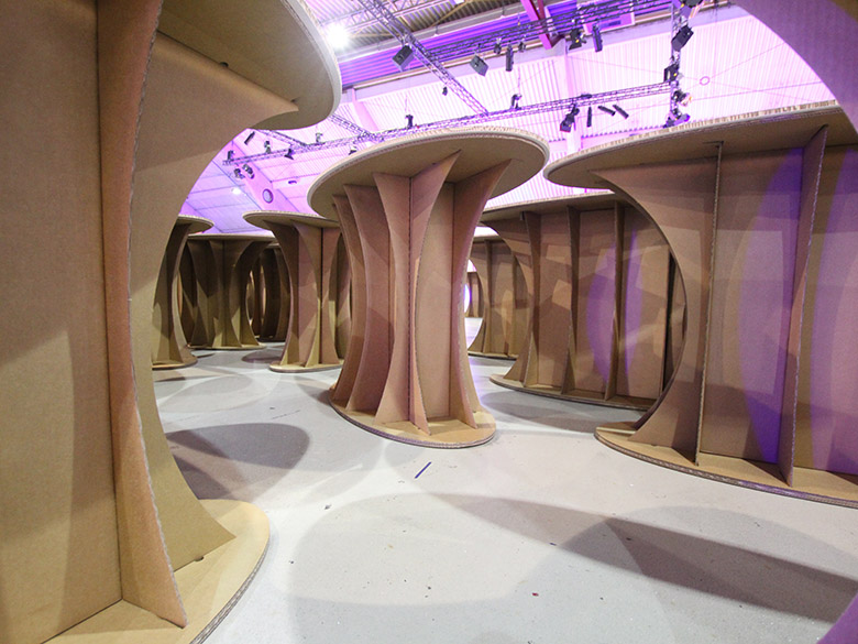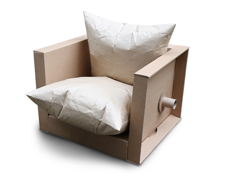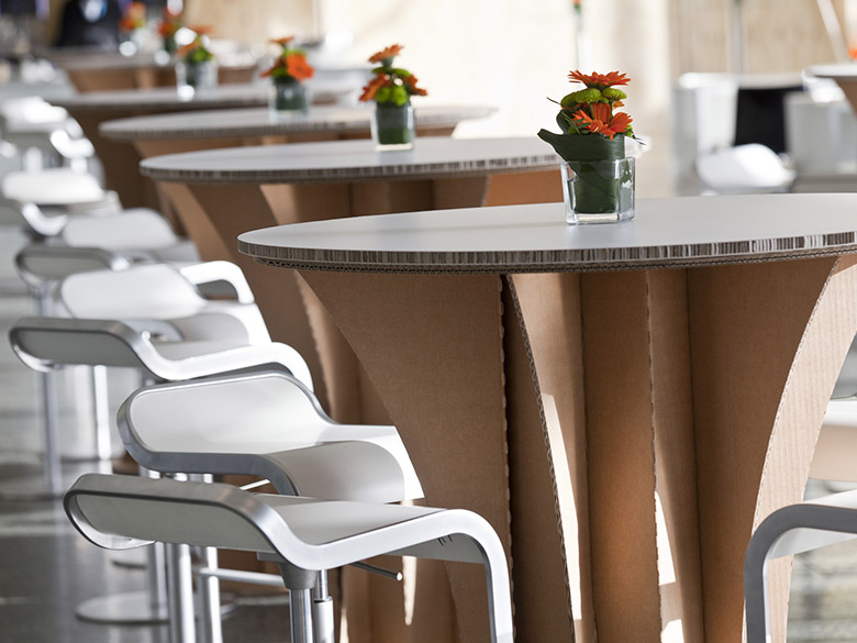 Für die nachhaltige und leicht zu transportierende Möbelkollektion wurden Pappe und Papier als Werkstoff verwendet. Hierfür wurden Halbzeuge und recycelbare Materialien aufeinander abgestimmt. Für den Einsatz bei Veranstaltungen bedienen sich die Möbel stabiler Falt- oder Steckkonstruktionen, die sich leicht zu einem geringen Packmaß zerlegen lassen und ein geringes Eigengewicht aufweisen.