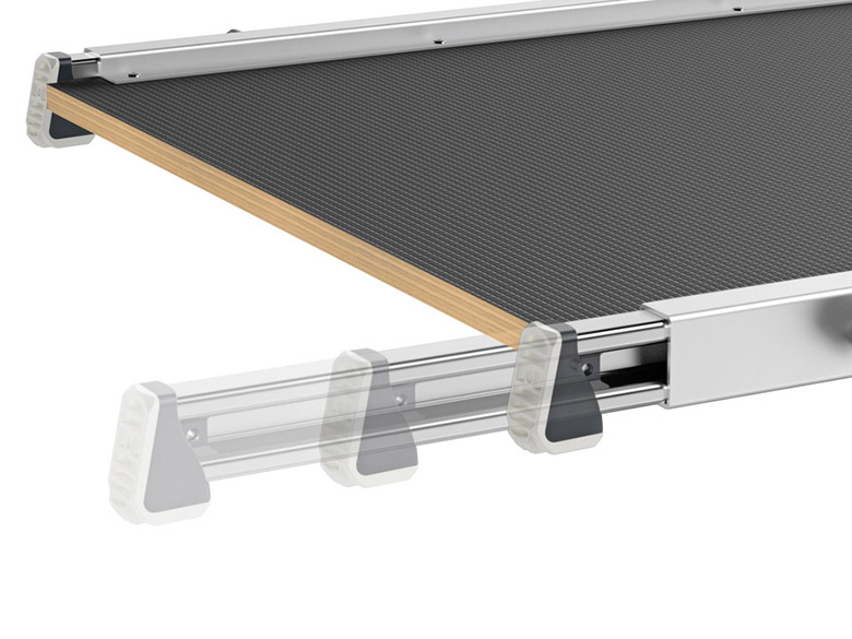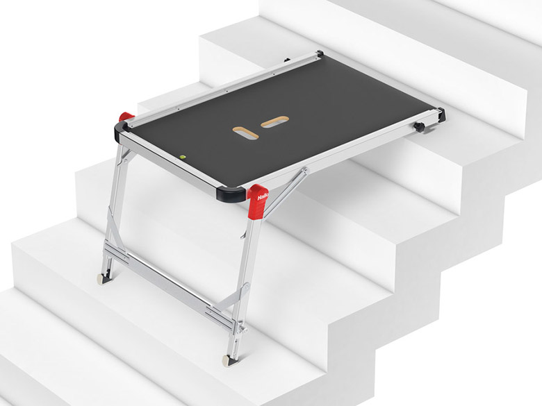 Für den Steiggeräte-Spezialist Hailo wurde das innovative Treppenpodest TP-1 entwickelt. Das kompakt klappbare Podest, das sich als Arbeitsplattform sowie als Basis für Hailo Tritt- und Stehleitern verwenden lässt, bietet mit rutschfester Stehfläche, teleskopierbaren Schienen und Soft-Grip-Füßen sicheren Stand auf geradläufigen und gewendelten Treppen. Das TP-1 wurde 2018 mit dem iF Design-, Red Dot Design-, Plus X- und dem German Innovation Award in Gold ausgezeichnet.